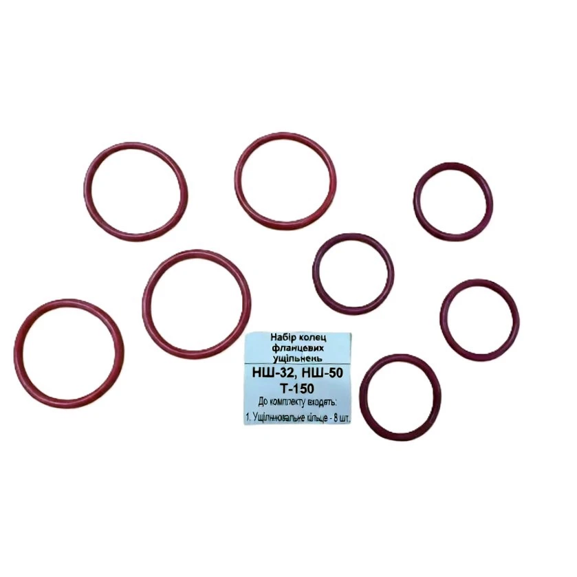 Це набір ущільнювальних елементів, призначений для відновлення герметичності гідравлічних насосів НШ‑32 та НШ‑50, які застосовуються на тракторах Т‑150 та їх модифікаціях. Комплект забезпечує надійне ущільнення фланцевих з’єднань, запобігає витоку робочої рідини та підтримує стабільний тиск у гідросистемі.